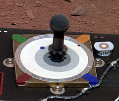 The red planet looks indeed red. The brownish gray sky as it would be seen by an observer on Mars in this four-frame true color mosaic taken on sol 24 at approximately 1610 LST. On Mars the greyscale went a bit blue just as it would with a blue sky but the two mirrors which reflect the sky went pinkish.